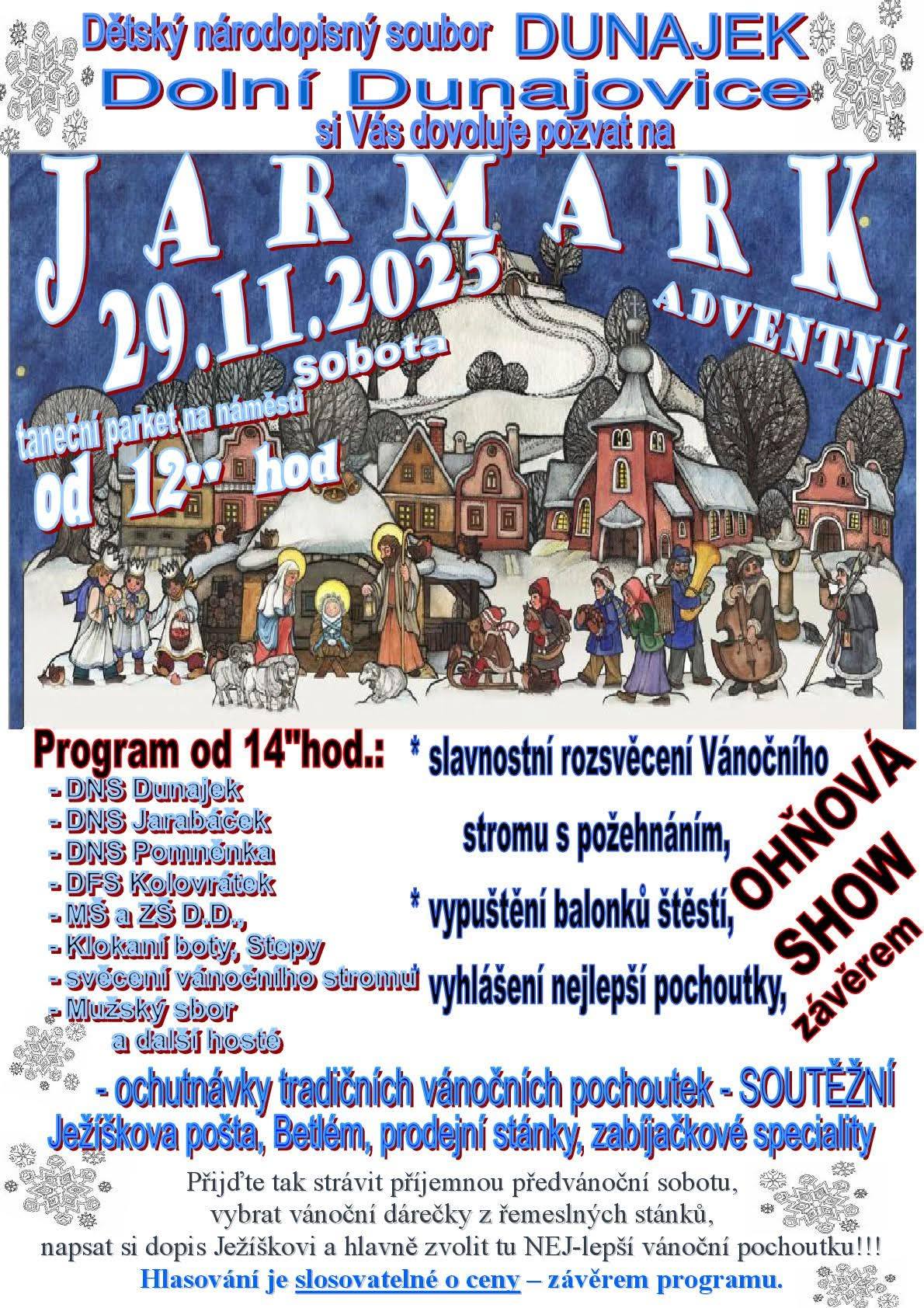 Organizátor Dětský národopisný soubor Dunajek O události První akcí adventního období v Dolních Dunajovicích je už tradičně Adventní jarmark, který se na tanečním parketu konal v sobotu 29. listopadu. Návštěvníci měli opět možnost zakoupit si zboží nejen s vánoční tématikou v mnoha stáncích, nechyběly ani oblíbené vánoční pochutiny jako svařené víno, punč, langoš nebo bramborák. Dunajek připravil také program, ve kterém děti ze spřátelených souborů, z Dunajku i ze základní a mateřské školy představily svá pásma. Těsně před setměním byl pak za přítomnosti faráře Josefa Kohoutka rozsvěcen vánoční strom. Nejoblíbenější pochutinou byly zvoleny langoše, připravované Klubem důchodců. Odkazy (1) - Zpravodaj