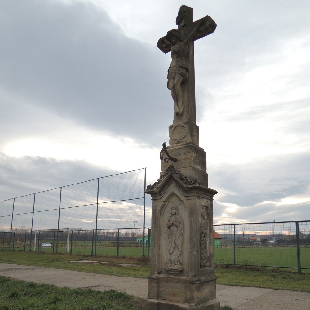 Na dvoustupňové podnoži stojí čtyřboký dvakrát odstupňovaný podstavec, jehož dvoudílná základna je na přední straně členěna vpadlým pásem, probíhajícím na osu svisle přes oba stupně. Ve vpadlé střední části druhého stupně je minuskulní nápis:Zur Ehre Gottes/errichtet von Eheleuten/Franz u. A. Maria Müller/Im Jahre 188(7) Dřík podstavce je na čelní straně a po stranách členěn vpadlými rámy s okosením a výžlabkem. Rám na čelní straně plynule navazuje na vpadlý střed obou stupňů základny a nahoře je završen lomeným obloukem. Rámy po stranách jsou menší, ve tvaru sedlového portálu. V rámu na čelní straně je vysoký relief stojící Panny Marie s rukama sepjatýma na hrudi, pohledově vpravo je reliéf stojící sv. Máří Magdaleny s lebkou, pohledově vlevo relief sv. Jana Evangelisty u pultu s knihou a kalichem, z něhož vylézá had, se svitkem v pravé ruce a s orlem u nohou. Podstavec je ukončen římsovou deskou, na čelní straně stříškovitě zalomenou a zdobenou rozvilinami a palmetou. Na římsové desce stojí odstupňovaná čtyřboká hranolová trnož a na ní kříž, jehož krychlovitou patku zdobí plastický vavřínový věnec, lemující nápis: Es ist/vollbracht. Ramena kříže jsou zakončená trojlistem. Kristovo tělo je prověšeno ve tvaru Y, hlava s mohutnou trnovou korunou je mírně skloněna k pravému rameni. Bohatě zřasená bederní rouška je svázána na pravém boku. Detailně propracovaný hrudní koš. Nad hlavou nápisový štítek INRI. V trnoži pod křížem je ukotveno kované rameno lucerny. Kříž je komponován výhradně pro čelní pohled, zezadu je zcela plochý. Materiál: maletínský pískovec Rozměry: výška cca 5 mGPS 16.5966061E, 48.8492964N Související místo U Rybníka Zdroj Památkový katalog