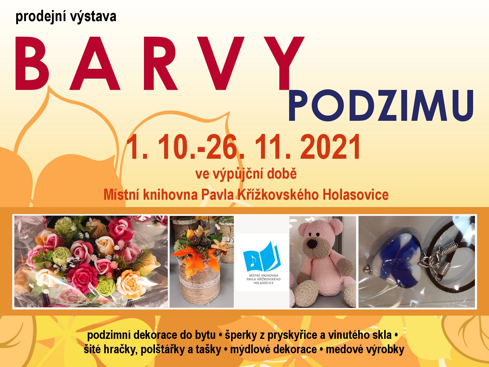 Název Barvy podzimu Jiný název prodejní výstava Typ události Kultura Klíčová slova výstavy, Místní knihovna Pavla Křížkovského Holasovice Datum a místo konání 01. 10. 2021 - 26. 11. 2021