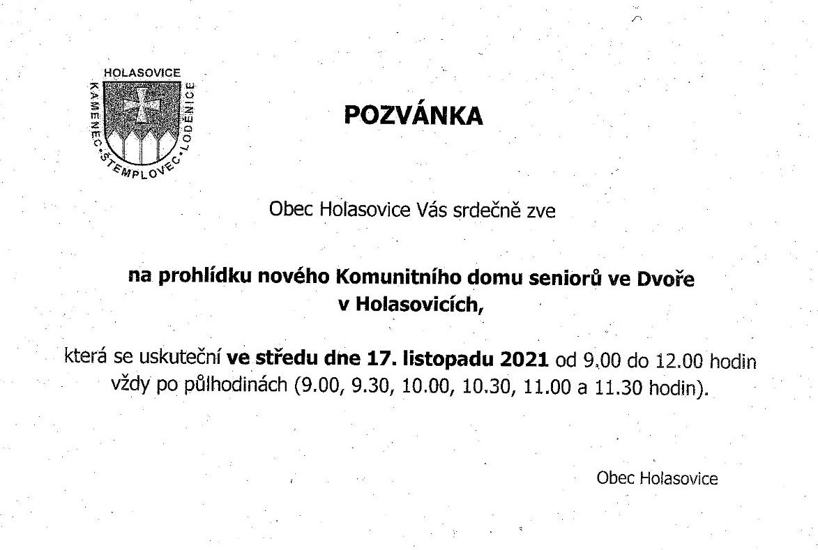 Název Prohlídka Komunitního domu seniorů v Holasovicích Typ události Veřejná správa a výstavba v obci Klíčová slova Komunitní dům, Holasovice, prohlídka Datum a místo konání 17. 11. 2021, 09:00 hod. - 17. 11. 2021, 12:00 hod.
