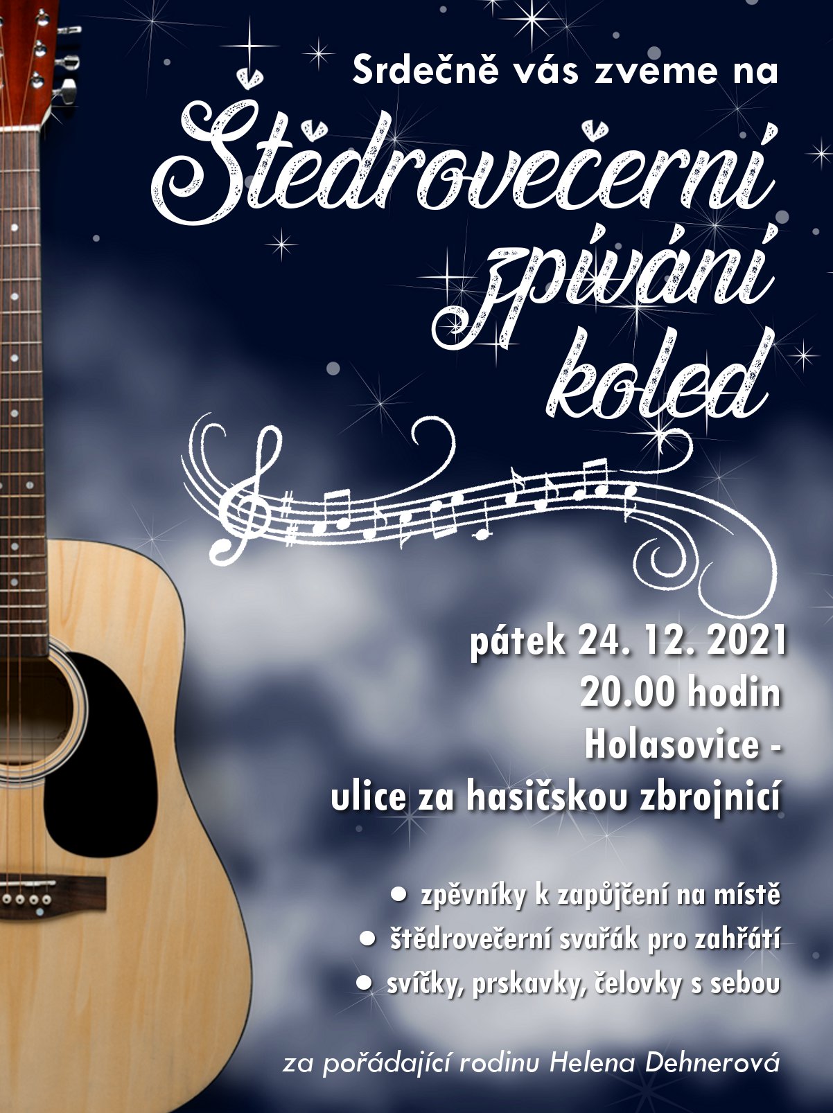 Název Štědrovečerní zpívání koled Typ události Kultura Klíčová slova koledy, zpívání koled Datum a místo konání 24. 12. 2021, 20:00 hod. - 24. 12. 2021, 21:00 hod.