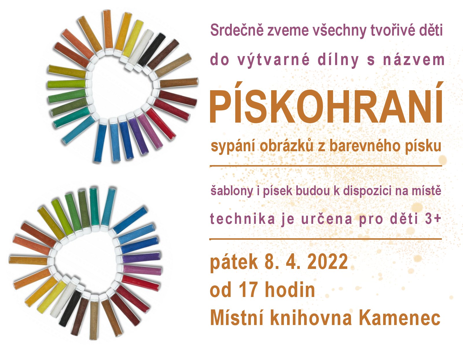 Organizátor Místní knihovna Kamenec O události Výtvarná dílna pro děti 3+. Vytváření obrázků pomocí barevného písku.