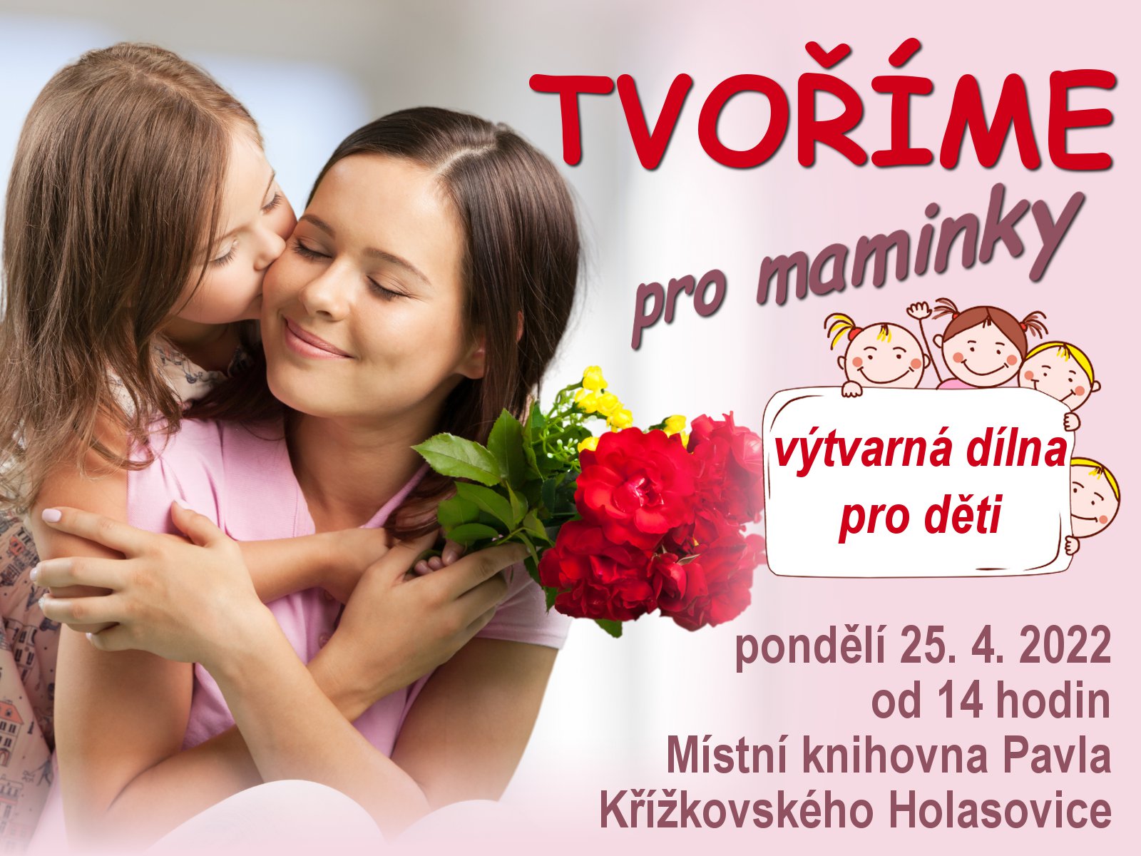 O událostiVýtvarná dílna pro kreativní děti, zaměřená na nadcházející svátek maminek.