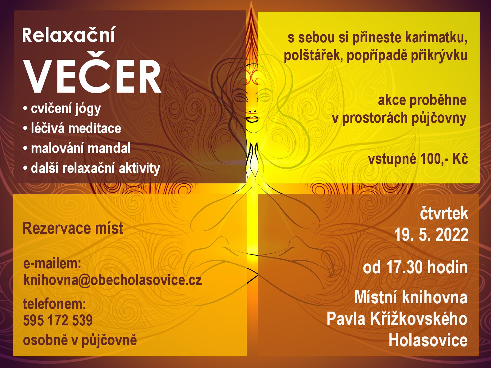 Organizátor Místní knihovna Pavla Křížkovského Holasovice O události Relaxační večer v knihovně. Cvičení jógy, léčivá meditace, malování mandal a jiné relaxační aktivity. Vstupné na tuto akci je 100,- Kč.