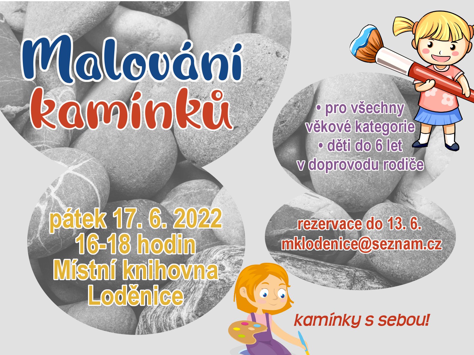 Organizátor Místní knihovna Loděnice O události Další výtvarná dílna s tématem malování na kamínky, tentokrát v knihovně v Loděnici. Akce je určena všem věkovým kategoriím. Děti do 6 let se smí zúčastnit za doprovodu dospělé osoby (rodič, prarodič, starší sourozenec,...). Kamínky si přineste s sebou.