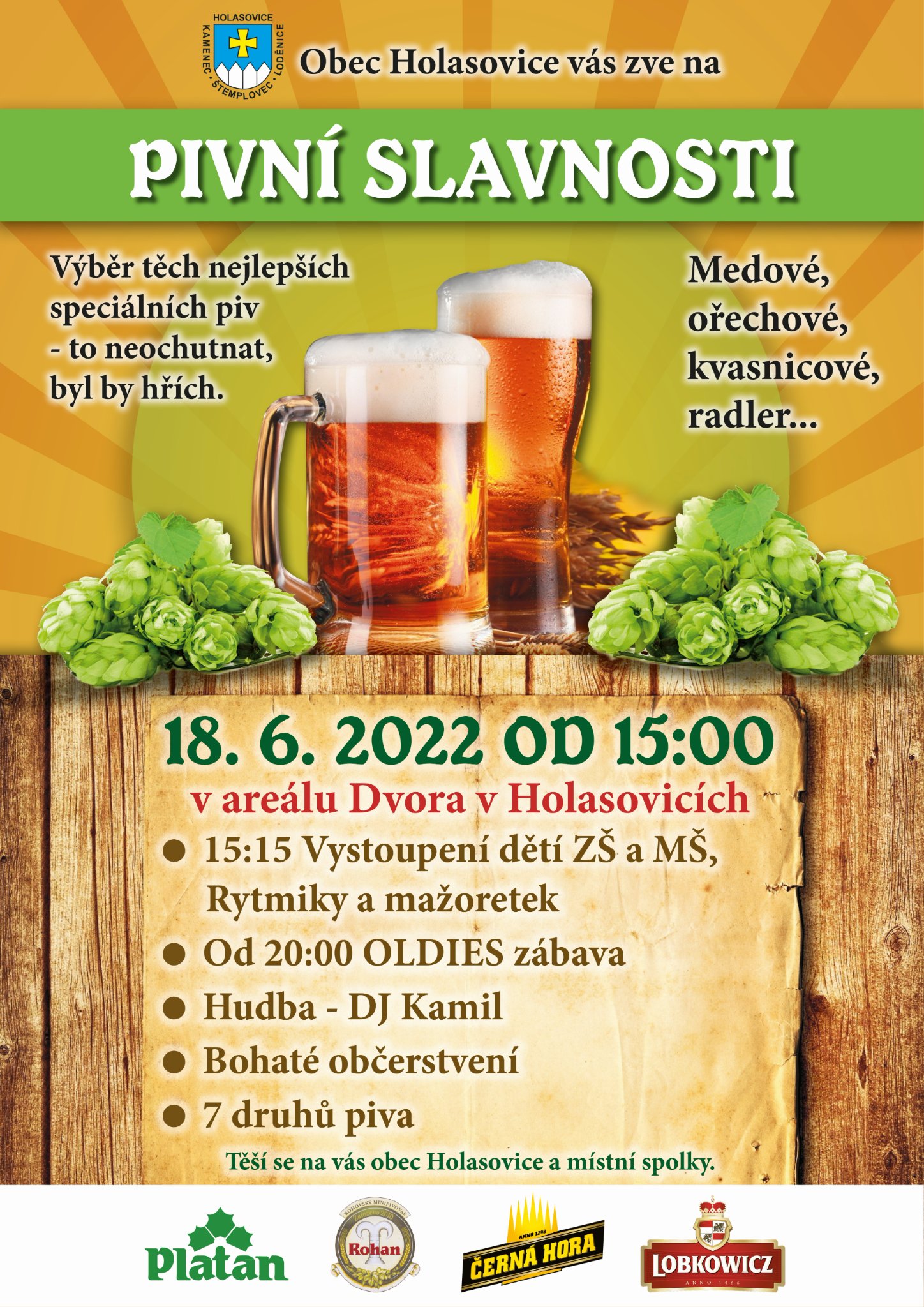 O událostiTradiční pivní slavnost v areálu Dvora v Holasovicích. K ochutnání je připraven výběr z nejlepších speciálních piv - medové, ořechové, kvasnicové, radler a další. Těšit se můžete na bohatý kulturní program a večerní zábavu s DJ Kamilem.