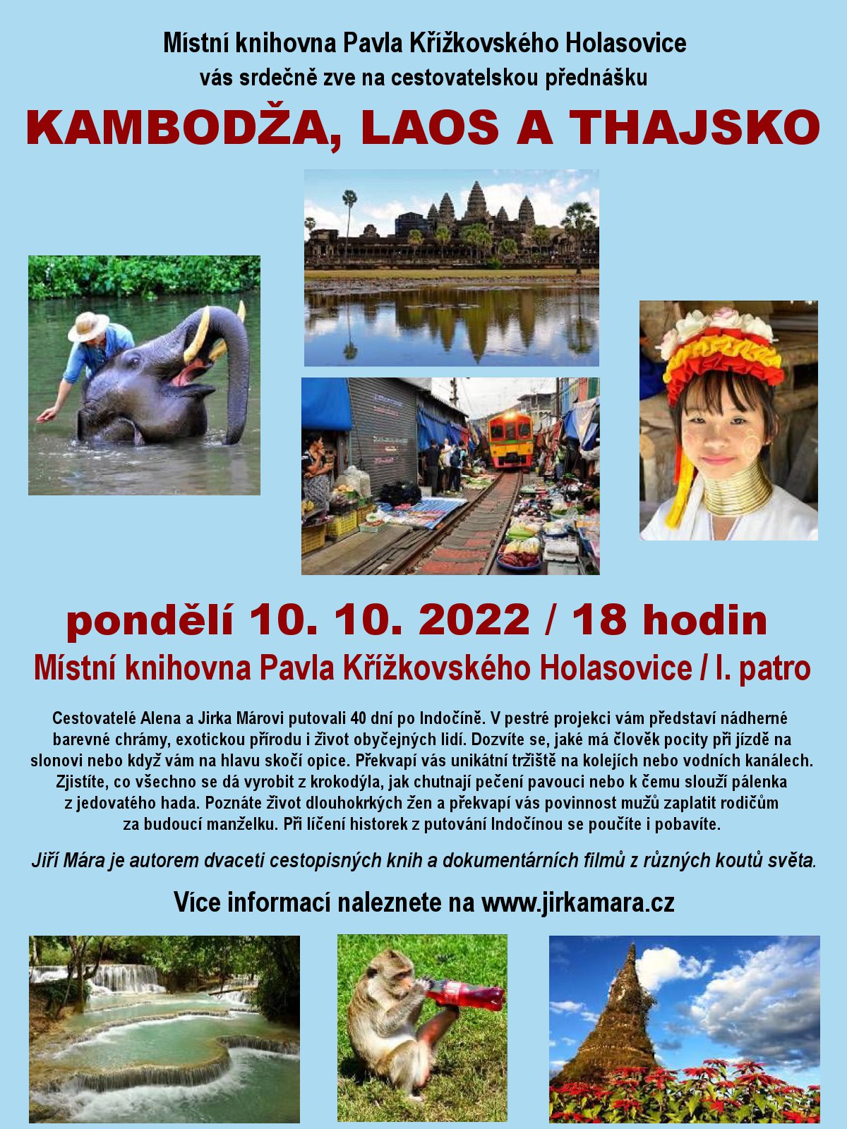 Název Kambodža, Laos a Thajsko Jiný název cestovatelská přednáška Typ události Kultura Klíčová slova akce pro veřejnost, přednáška, cestovatelská přednáška, Místní knihovna Pavla Křížkovského Holasovice Datum a místo konání 10. 10. 2022, 18:00 hod. - 10. 10. 2022, 20:00 hod.
