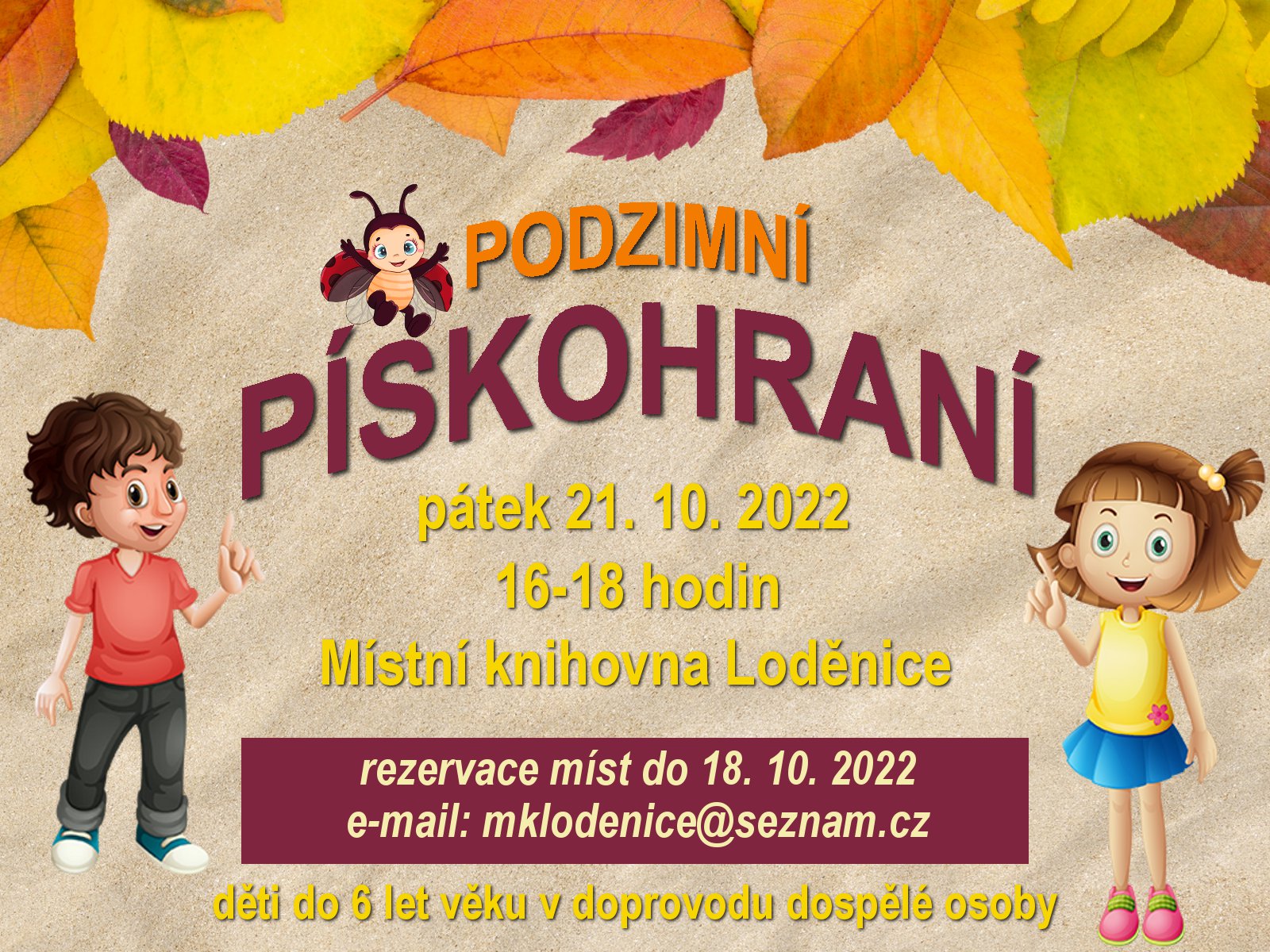 Organizátor Místní knihovna Loděnice O události Výtvarná dílna s podzimní tématikou. Děti budou vytvářet obrázky sypáním barevného písku do připravených šablon. Na akci si rezervujte místa. Děti do 6 let věku se mohou zúčastnit v doprovodu dospělé osoby.