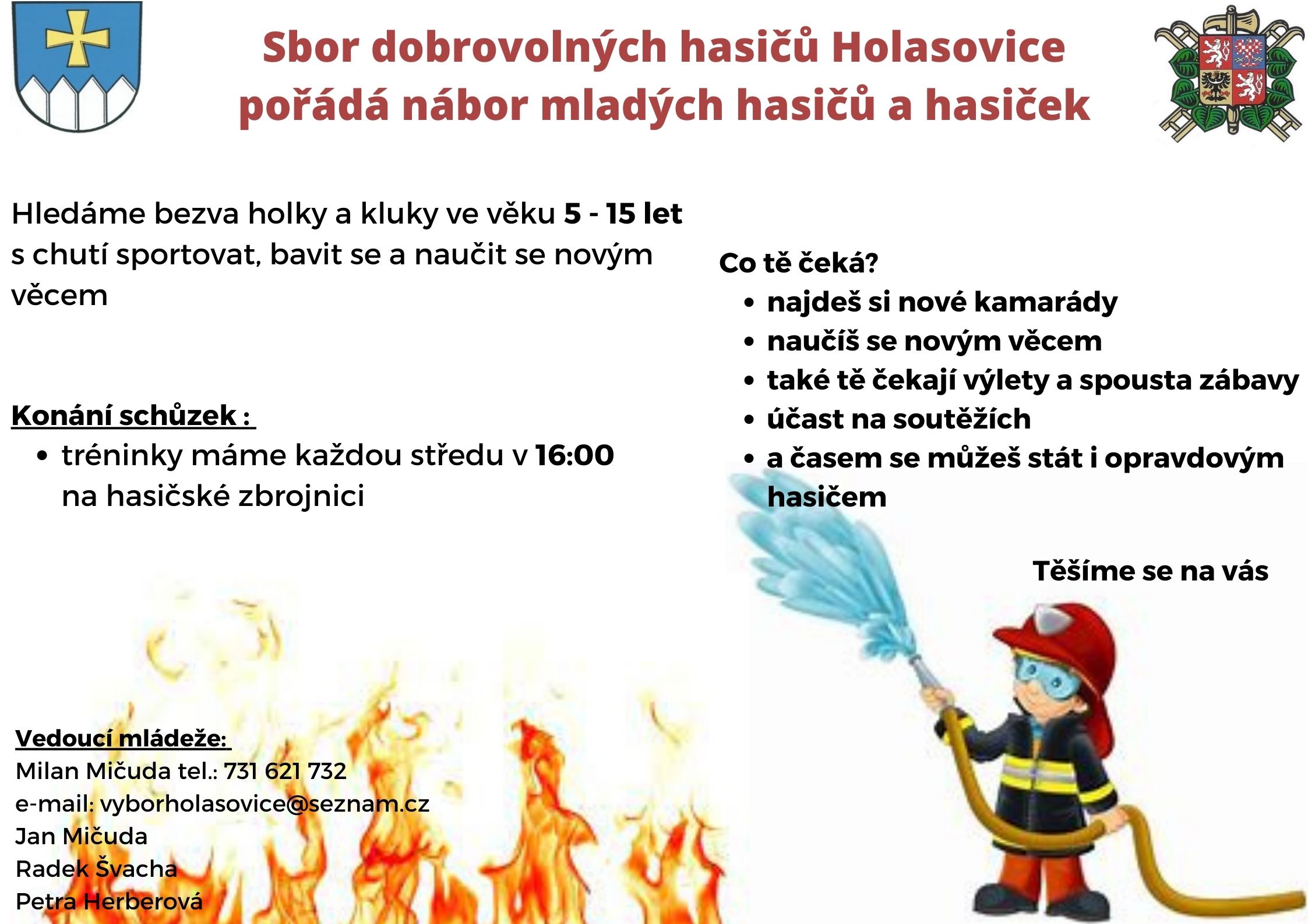 Organizátor Sbor dobrovolných hasičů Holasovice O události Nábor budoucích mladých hasičů a hasiček ve věku 5-15 let.
