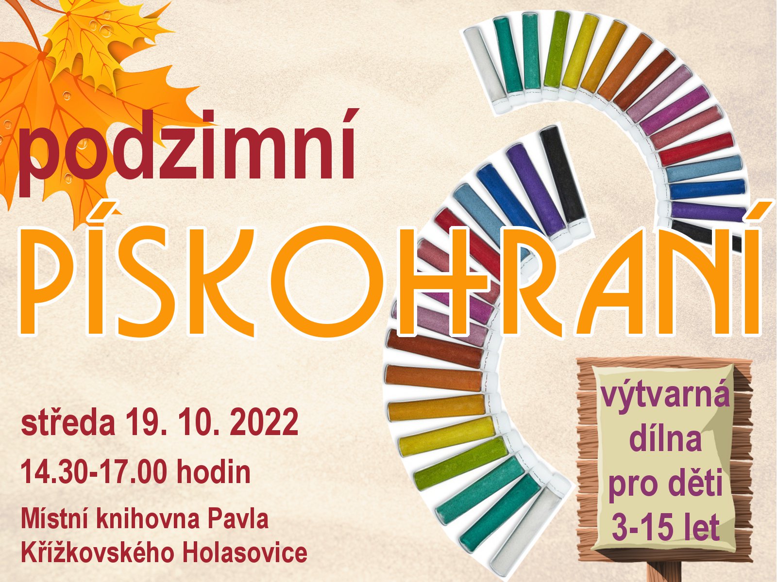 Organizátor Místní knihovna Pavla Křížkovského Holasovice O události Oblíbené pískohraní, tentokrát s podzimní tématikou.