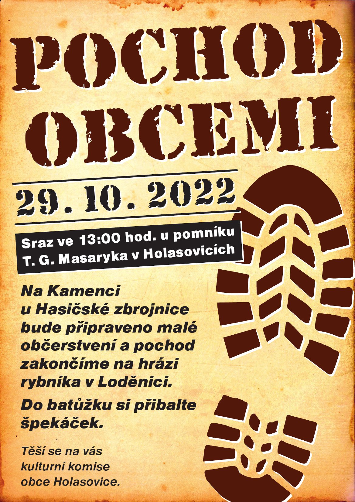 Organizátor Komise sportovní a kulturní O události Tradiční pochod našimi obcemi. Sraz je ve 13 hodin u pomníku T. G. Masaryka v Holasovicích, v Kamenci bude připraveno malé občerstvení a pochod bude zakončen na hrázi rybníka v Loděnici. Špekáček na závěrečné opékání si vemte s sebou.