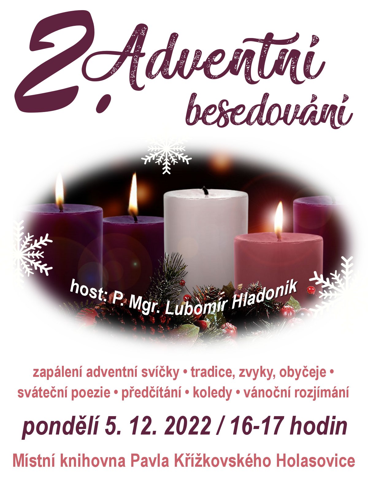Organizátor Místní knihovna Pavla Křížkovského Holasovice O události Hodinka v knihovně, která vás pohladí po duši. Zapálíme adventní svíci, připomeneme si vánoční tradice, zvyky a obyčeje, poslechneme vánoční poezii, budeme si předčítat z klenotů domácí i světové literatury, zazpíváme vánoční písně a koledy a pobesedujeme spolu. Toto hodinové setkání se uskuteční čtyřikrát, vždy v pondělí po adventní neděli. Hostem setkání je P. Mgr. Lubomír Hladonik.