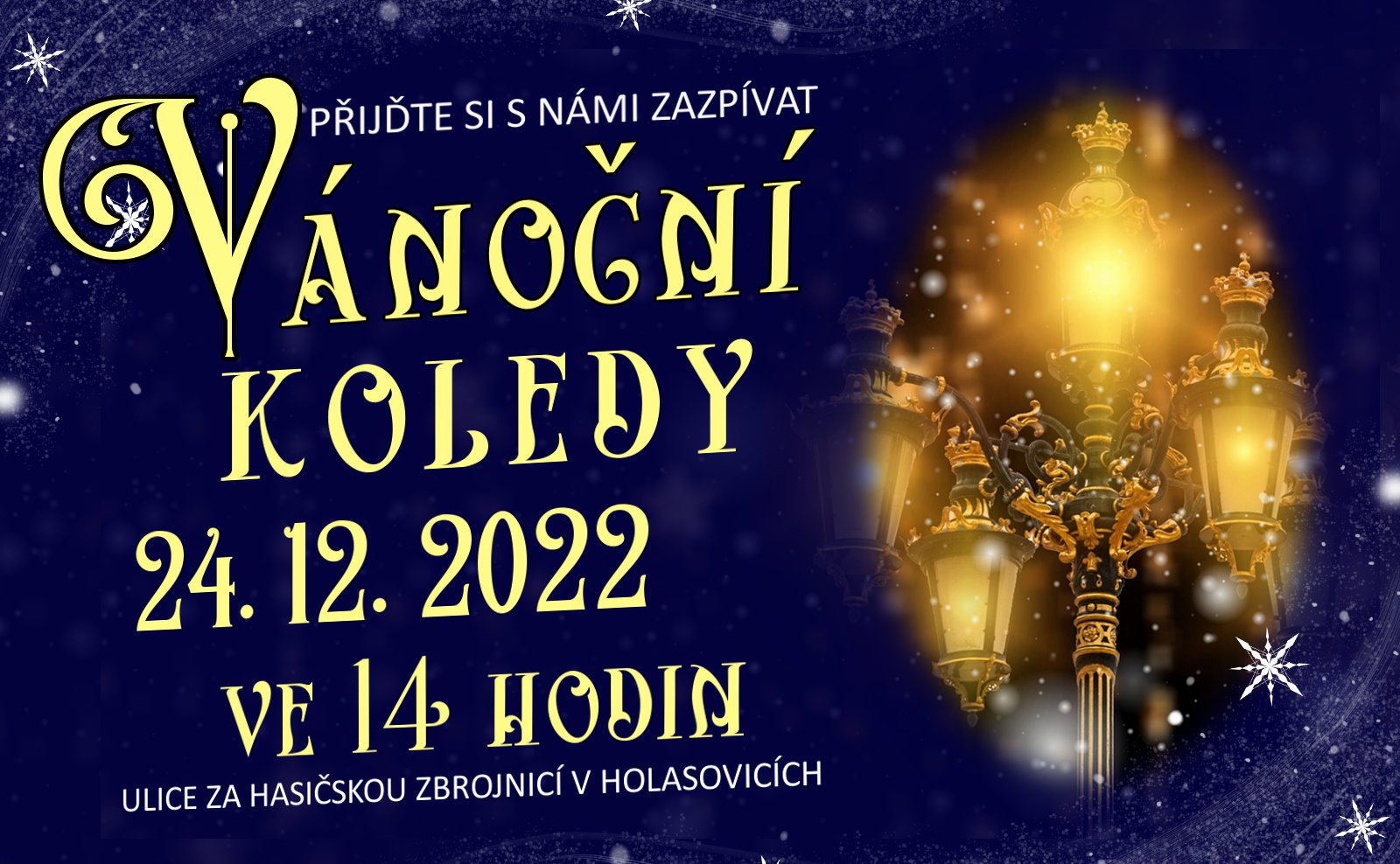 Organizátor Místní knihovna Pavla Křížkovského Holasovice O události Zpívání koled pod sváteční oblohou. Texty ke koledám budou k zapůjčení na místě, pro zahřátí bude připraven voňavý svařák.