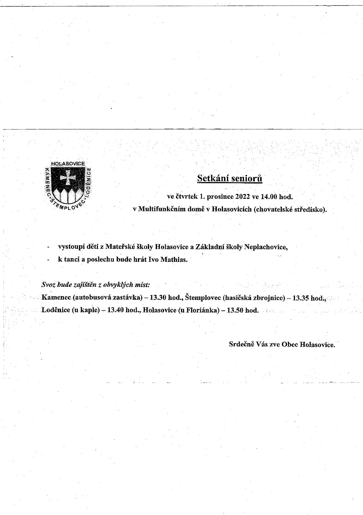 Organizátor Obec Holasovice O události Tradiční setkání seniorů. Na akci vystoupí děti Mateřské školy Holasovice a Základní školy Neplachovice. K tanci a poslechu bude hrát Ivo Mathias. Svoz je zajištěn z obvyklých míst.