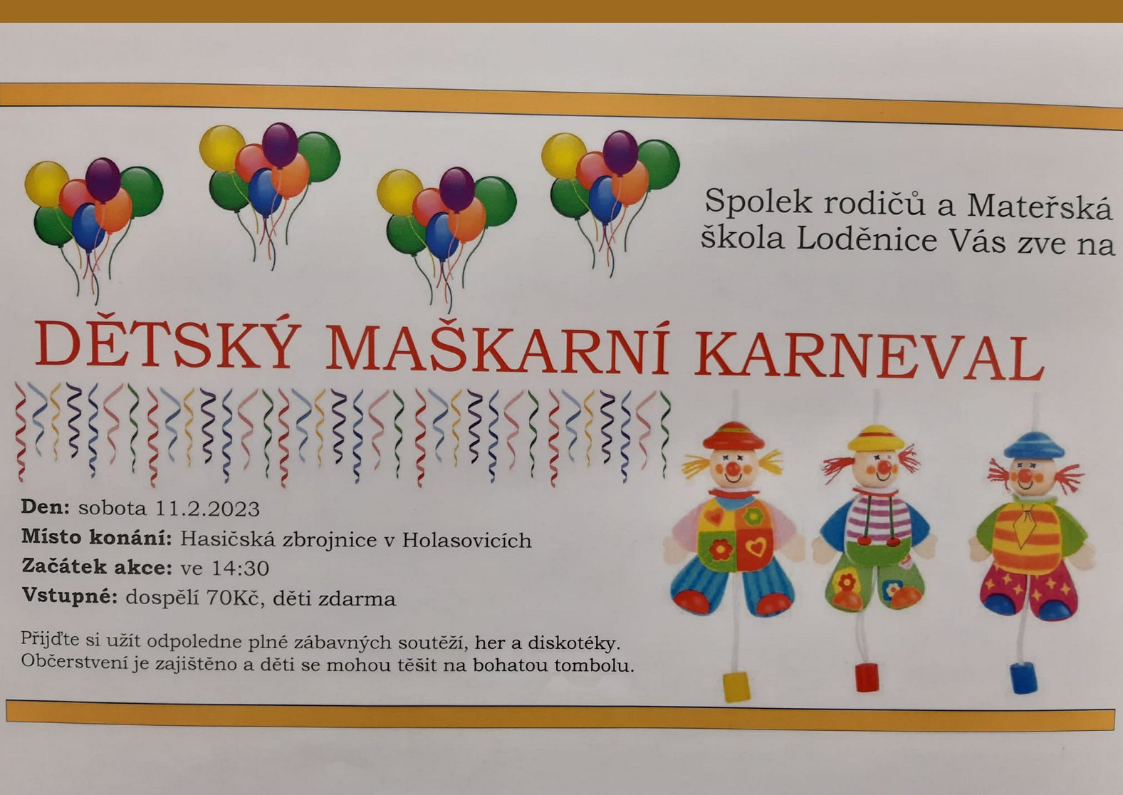 Název Dětský maškarní karneval Typ události Kultura, Školství Klíčová slova akce pro veřejnost, maškarní ples, Mateřská škola Loděnice, Spolek rodičů při školce Holasovice Datum a místo konání 11. 02. 2023, 14:30 hod. - 11. 02. 2023, 17:00 hod.
