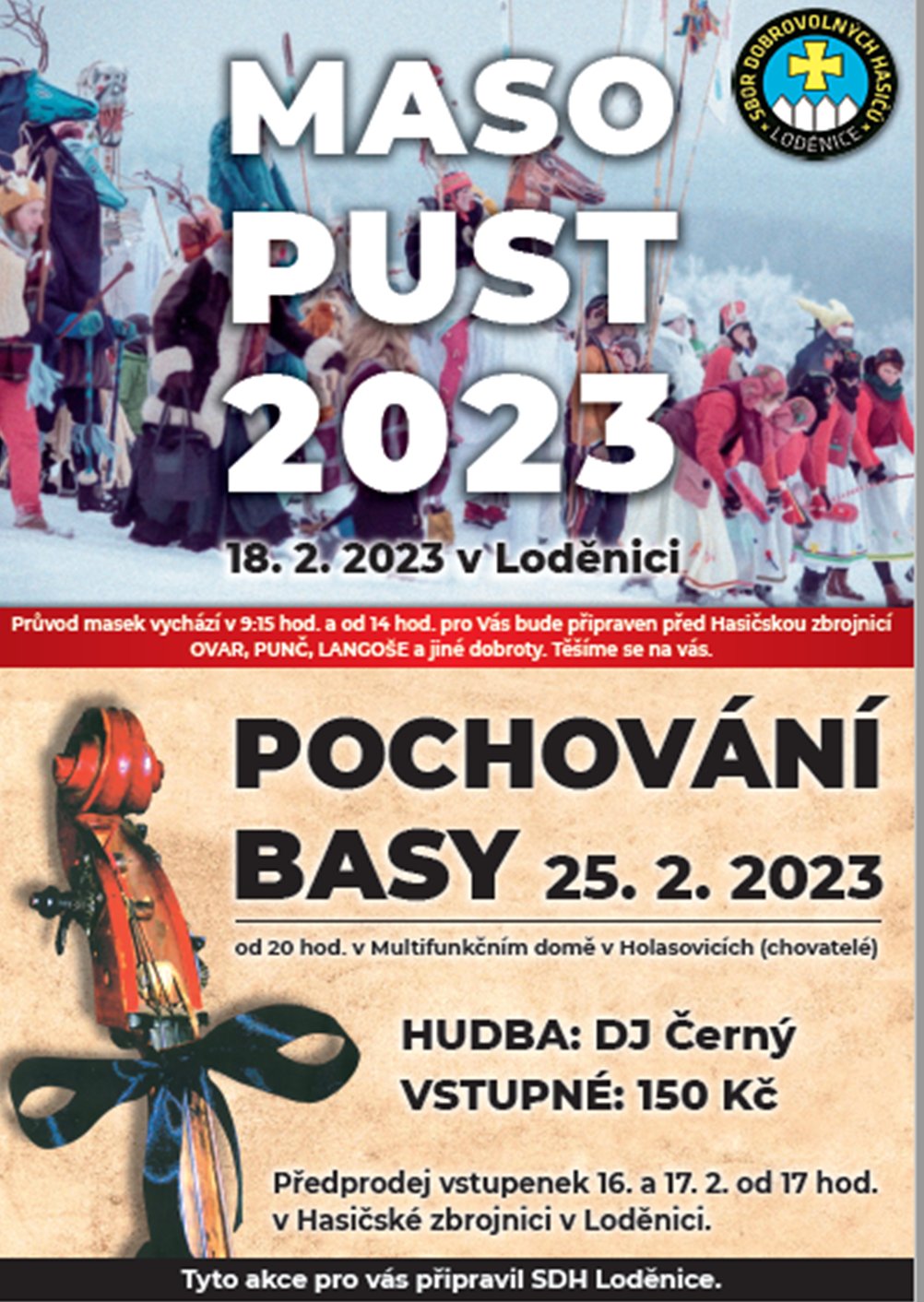 Organizátor Sbor dobrovolných hasičů Loděnice O události Pochování basy - uzavření plesové sezóny. K tanci a poslechu hraje DJ Černý. Vstupné 150 Kč. Předprodej vstupenek 16. a 17. 2. od 17 hodin v Hasičské zbrojnici v Loděnici.