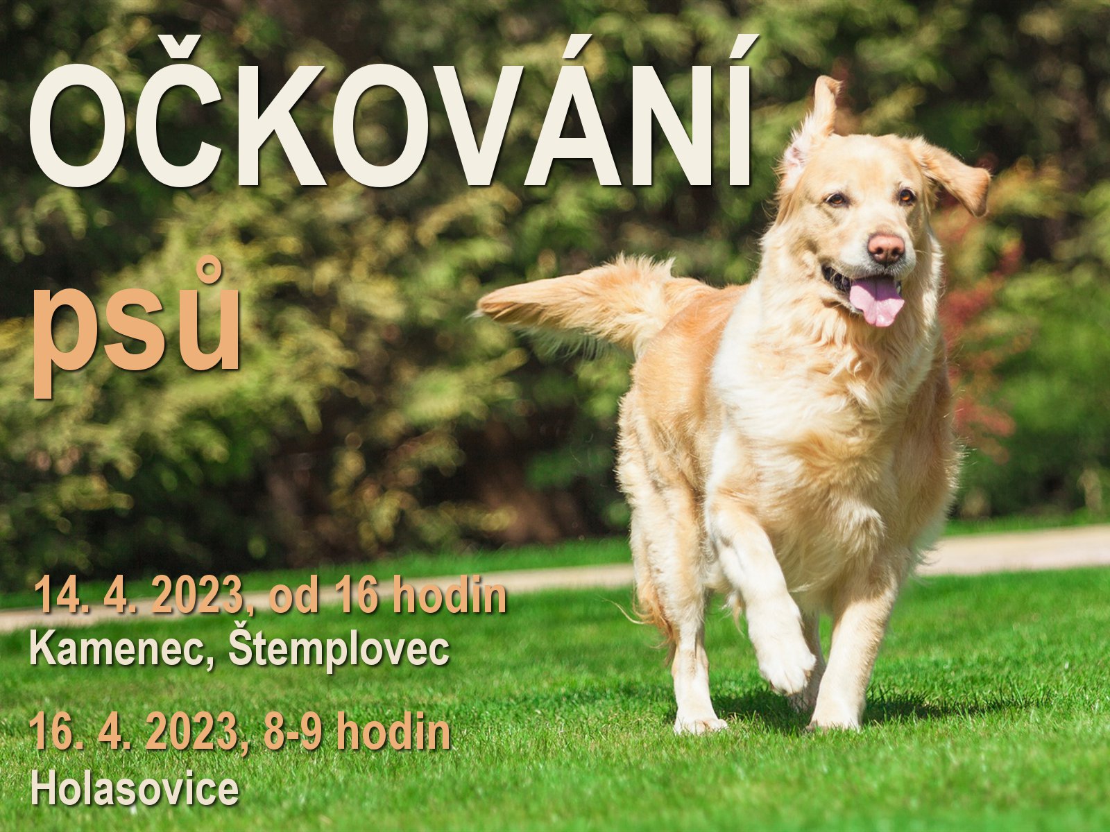Název Očkování psů proti vzteklině Typ události Různé Klíčová slova veterinární léčba, očkování psů, Roman Jokl Datum a místo konání 14. 04. 2023, 16:00 hod.