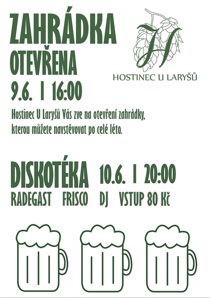 O událostiDiskotéka na zahradě Hostince U Laryšů. Vstupné je 80 Kč, na čepu bude Radegast i Frisco.