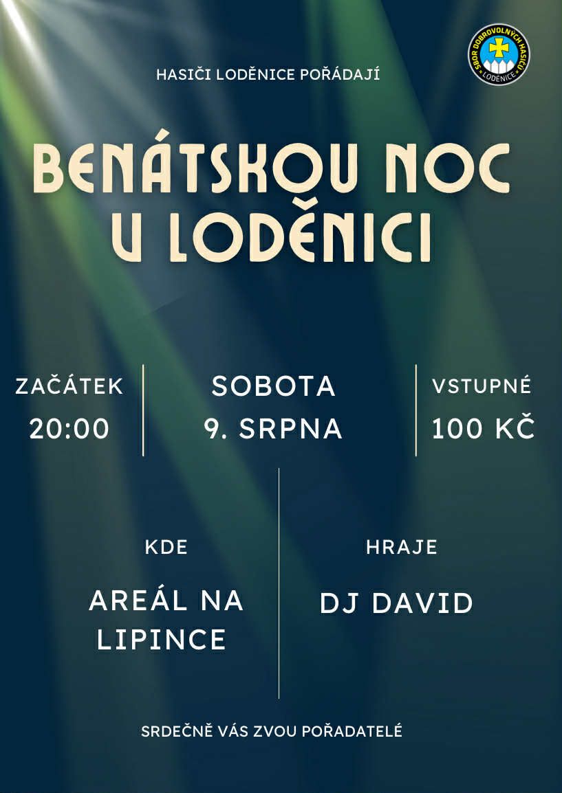 Organizátor Sbor dobrovolných hasičů Loděnice O události Benátská noc v Loděnici. K tanci a poslechu hraje DJ David. Vstupné je 100 Kč.