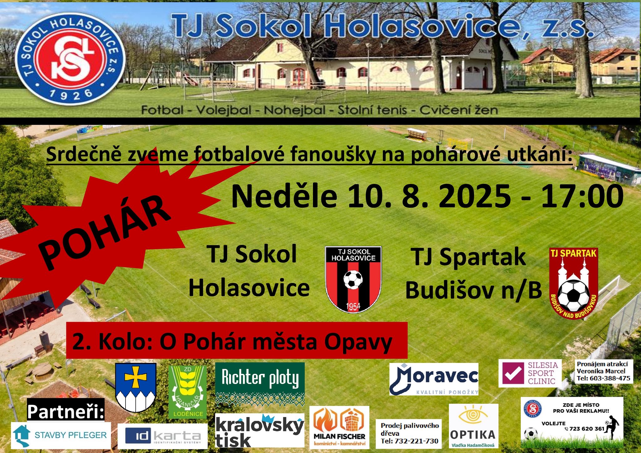 Název Pohárové utkání ve fotbale Typ události Sport Klíčová slova akce pro veřejnost, sportovní utkání, fotbal, TJ Sokol Holasovice Datum a místo konání 10. 08. 2025, 17:00 hod. - 10. 08. 2025, 19:00 hod.