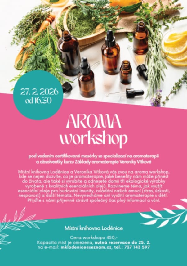Organizátor Místní knihovna Loděnice O události Srdečně vás zveme na Aroma workshop, který se uskuteční 27. února 2026 od 16:30 v Místní knihovně Loděnice. Pod vedením certifikované masérky a aromaterapeutky Veroniky Vítkové se seznámíte se světem aromaterapie, jejími přínosy pro tělo i psychiku a vyrobíte si vlastní ekologické produkty z kvalitních esenciálních olejů. Přijďte si odpočinout, načerpat inspiraci a užít si příjemný čas plný vůní. Kapacita je omezená – rezervace nutná.