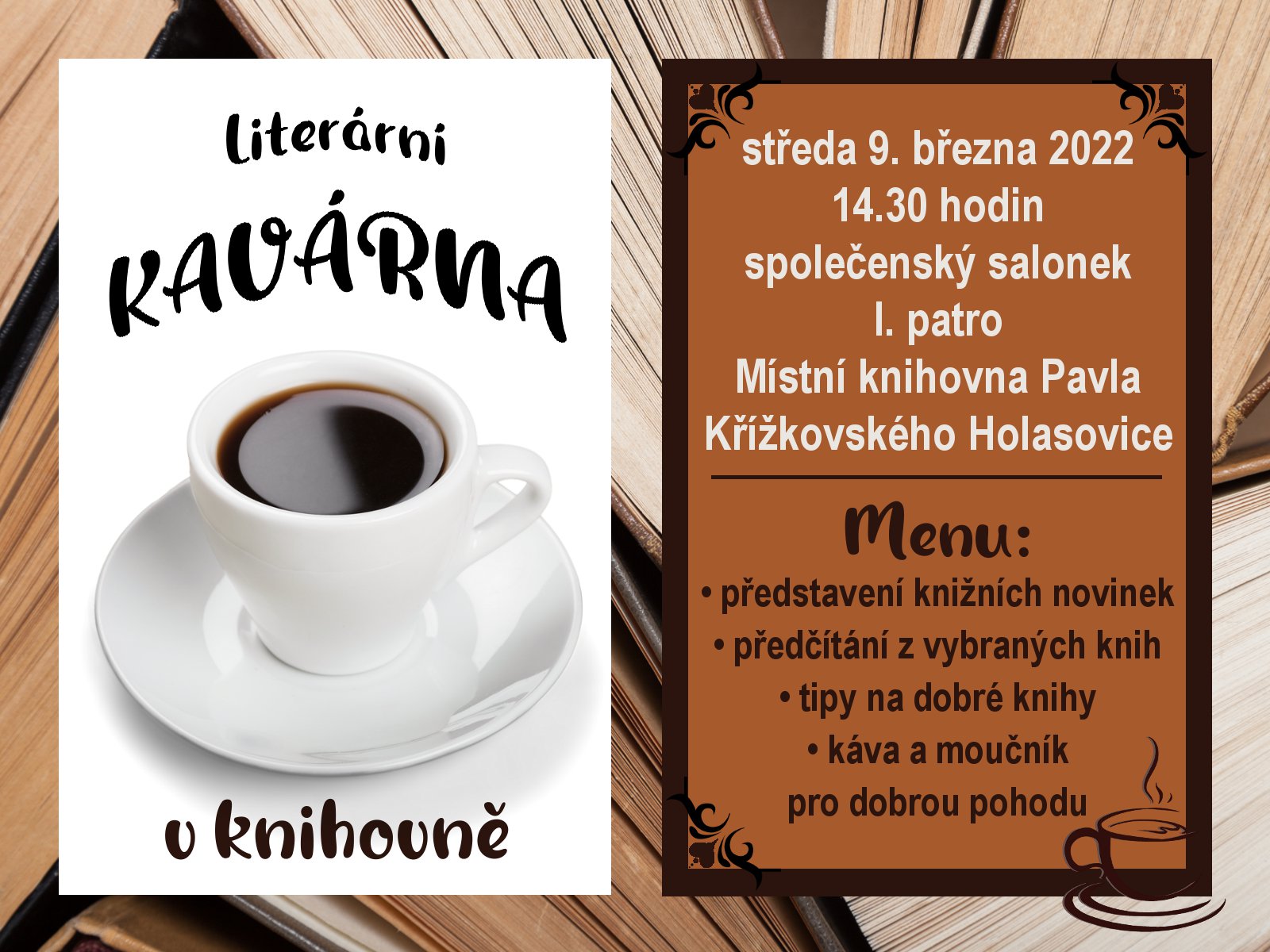 Název Literární kavárna Typ události Kultura Klíčová slova kulturní akce, pro čtenáře, literární kavárna Datum a místo konání 09. 03. 2022, 14:30 hod. - 09. 03. 2022, 16:30 hod.