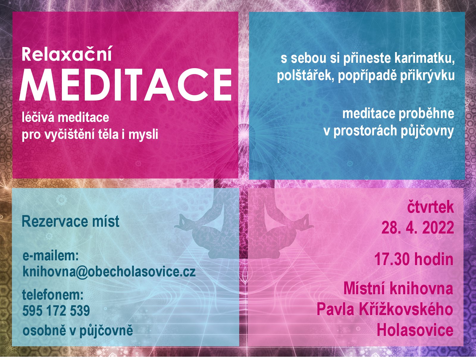 Organizátor Místní knihovna Pavla Křížkovského Holasovice O události Léčivá meditace pro vyčištění těla i mysli. Na tuto akci si rezervujte místa e-mailem na adrese knihovna@obecholasovice.cz, telefonem na čísle 595 172 539, nebo osobně v půjčovně.