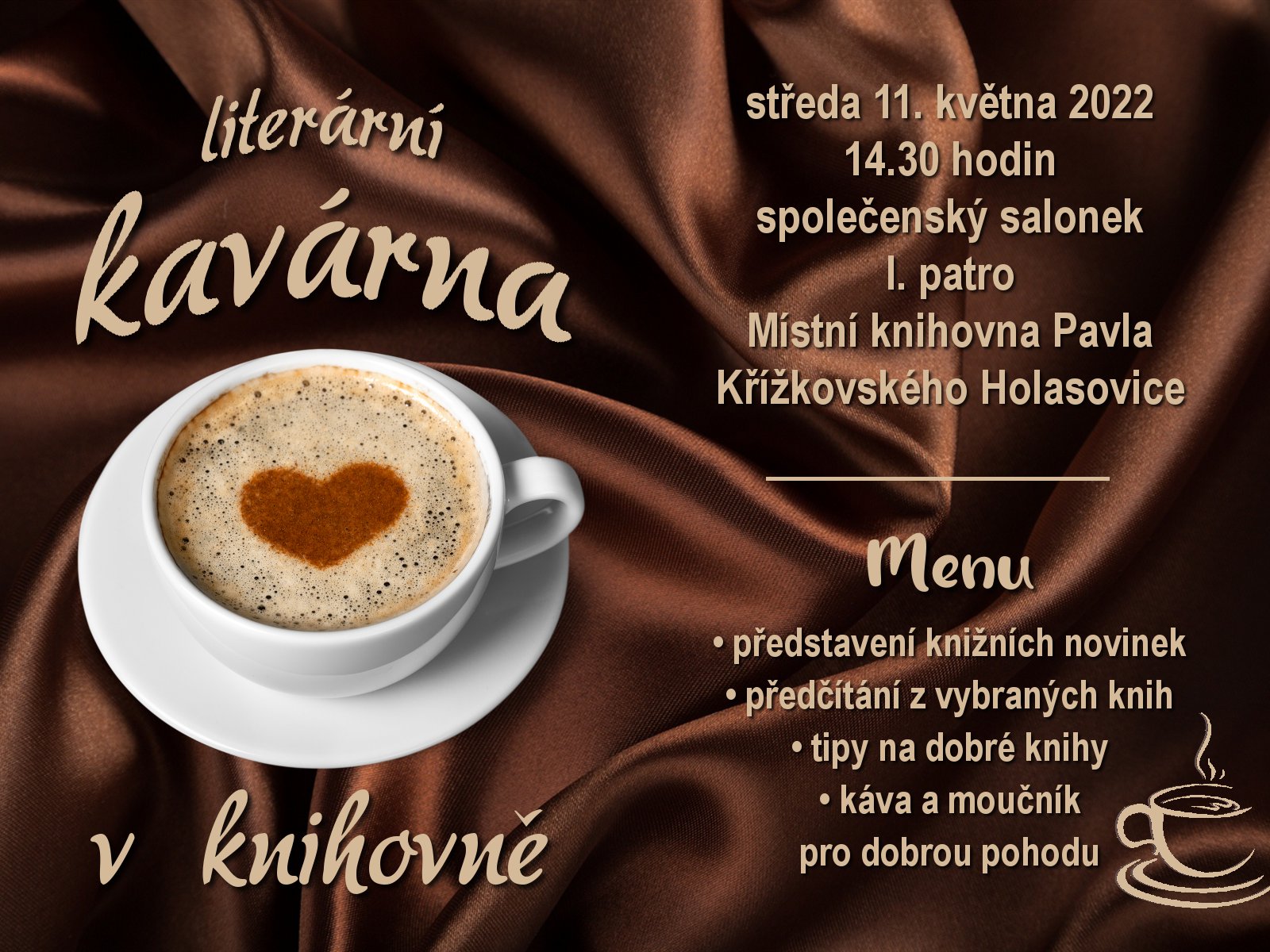 Klíčová slova literární kavárna, knižní novinky, předčítání, Místní knihovna Pavla Křížkovského Holasovice