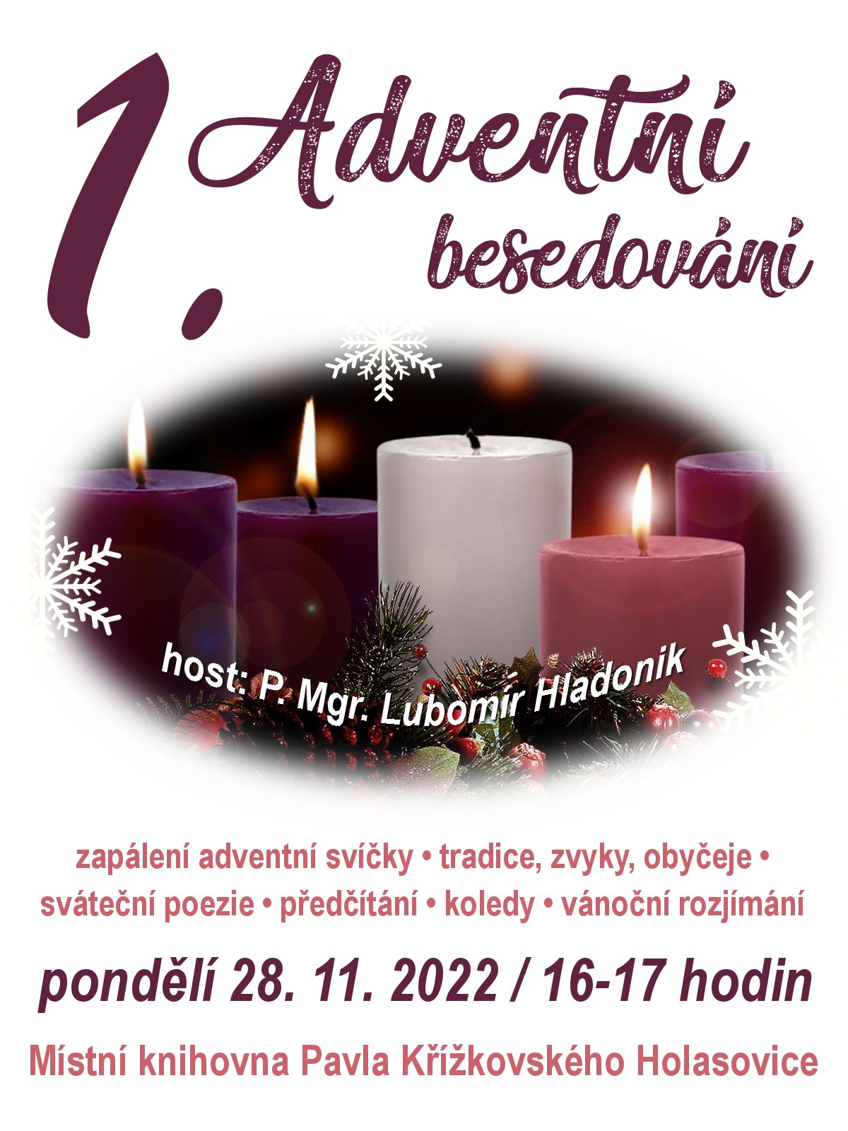 Organizátor Místní knihovna Pavla Křížkovského Holasovice O události Hodinka v knihovně, která vás pohladí po duši. Zapálíme adventní svíci, připomeneme si vánoční tradice, zvyky a obyčeje, poslechneme vánoční poezii, budeme si předčítat z klenotů domácí i světové literatury, zazpíváme vánoční písně a koledy a pobesedujeme spolu. Toto hodinové setkání se uskuteční čtyřikrát, vždy v pondělí po adventní neděli. Hostem prvního setkání je P. Mgr. Lubomír Hladonik.