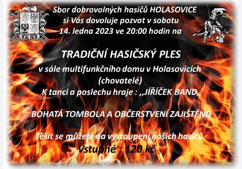 Organizátor Sbor dobrovolných hasičů Holasovice O události Tradiční hasičský ples s kulturním programem, občerstvením a bohatou tombolou. K tanci a poslechu hraje kapela Jiříček Band. Vstupné je 120 Kč.