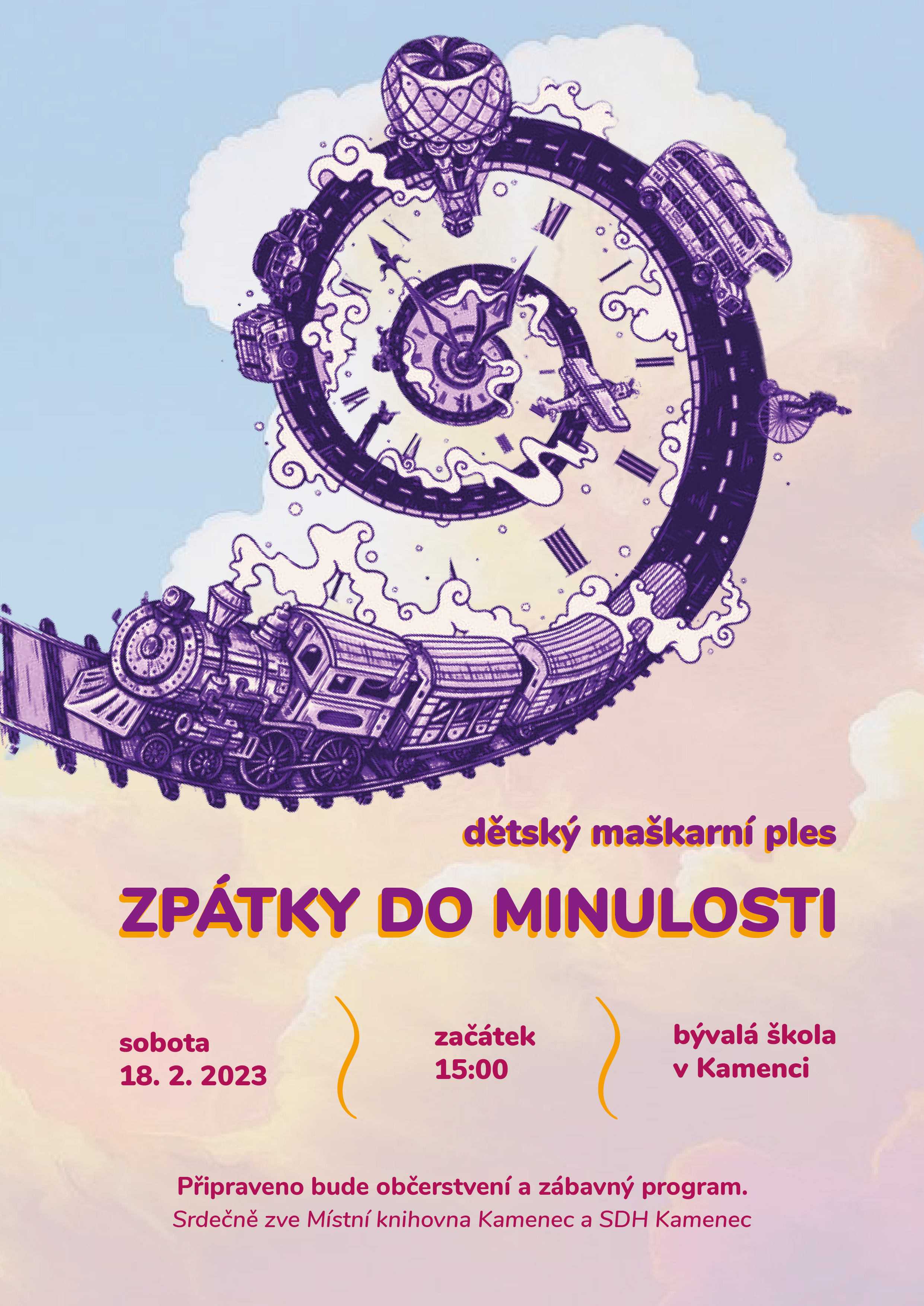 Název Zpátky do minulosti Jiný název dětský maškarní ples Typ události Kultura, Spolky a sdružení Klíčová slova akce pro veřejnost, akce pro děti, maškarní ples Datum a místo konání 18. 02. 2023, 15:00 hod. - 18. 02. 2023, 18:00 hod.
