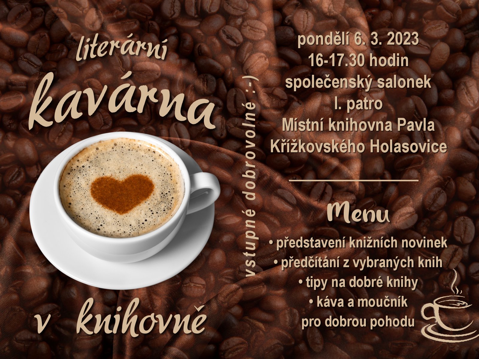 Název Literární kavárna Typ události Kultura Klíčová slova akce pro veřejnost, literatura, knižní novinky, literární kavárna, Místní knihovna Pavla Křížkovského Holasovice Datum a místo konání 06. 03. 2023, 16:00 hod. - 06. 03. 2023, 17:30 hod.
