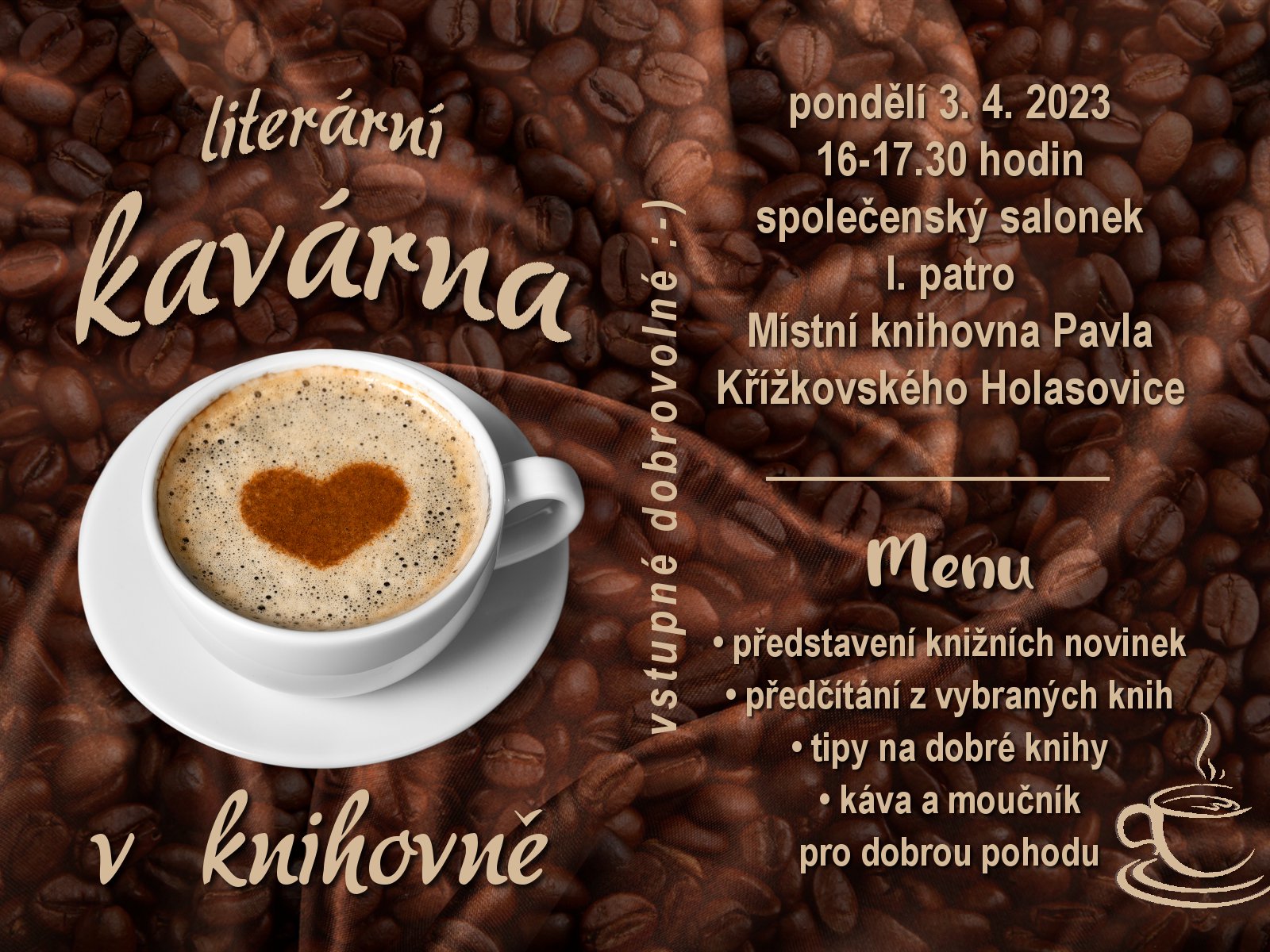 Klíčová slova akce pro veřejnost, literatura, knižní novinky, literární kavárna, Místní knihovna Pavla Křížkovského Holasovice
