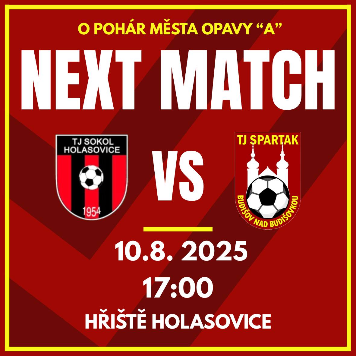 Název Pohárové utkání ve fotbale Typ události Sport Klíčová slova akce pro veřejnost, sportovní utkání, fotbal, TJ Sokol Holasovice Datum a místo konání 10. 08. 2025, 17:00 hod. - 10. 08. 2025, 19:00 hod.