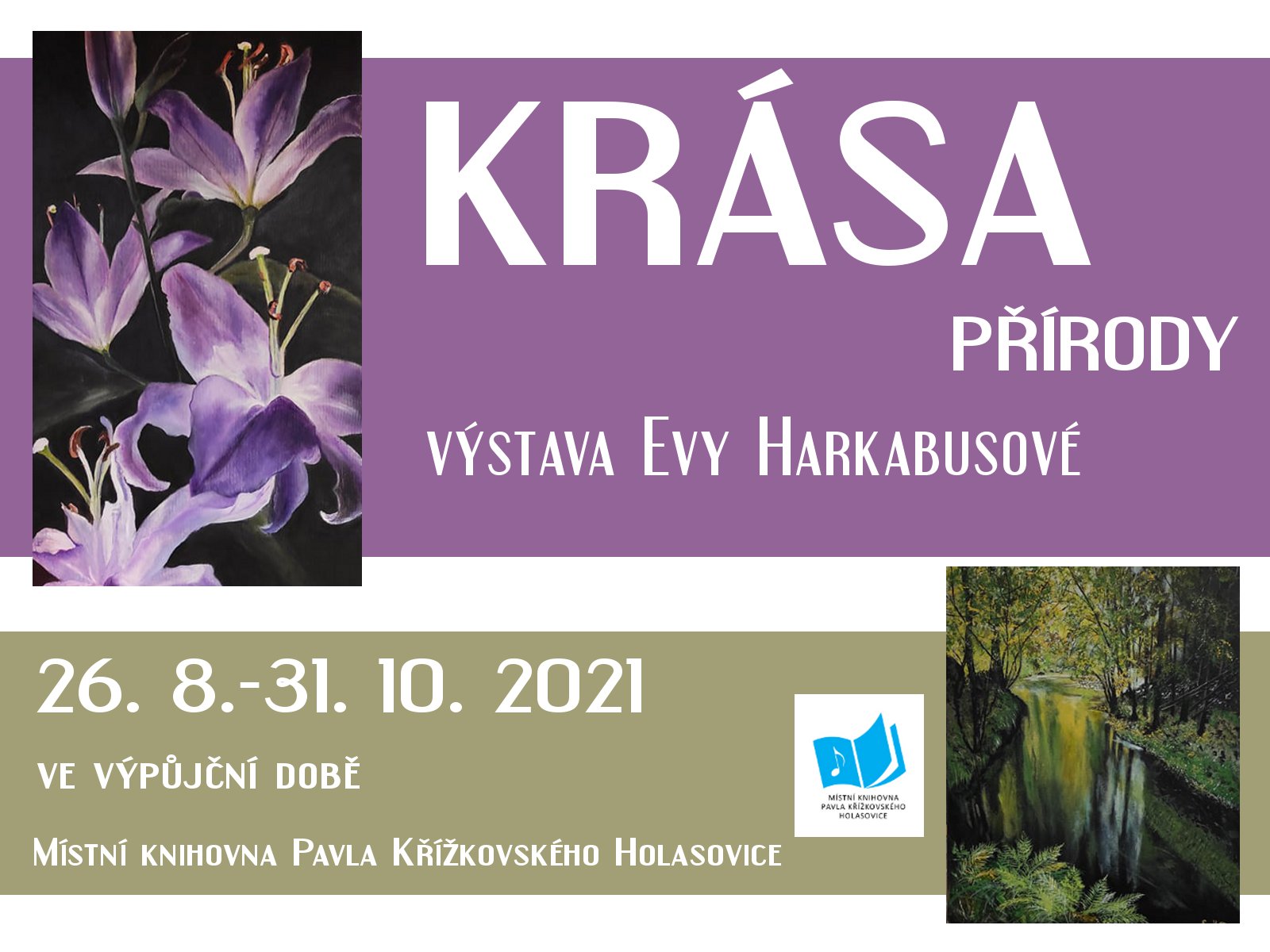 Title Krása přírody Other title výstava obrazů Evy Harkabusové Event type Culture Key words výstavy, Místní knihovna Pavla Křížkovského Holasovice, Eva Harkabusová Date and place of event 26. 08. 2021 - 31. 10. 2021