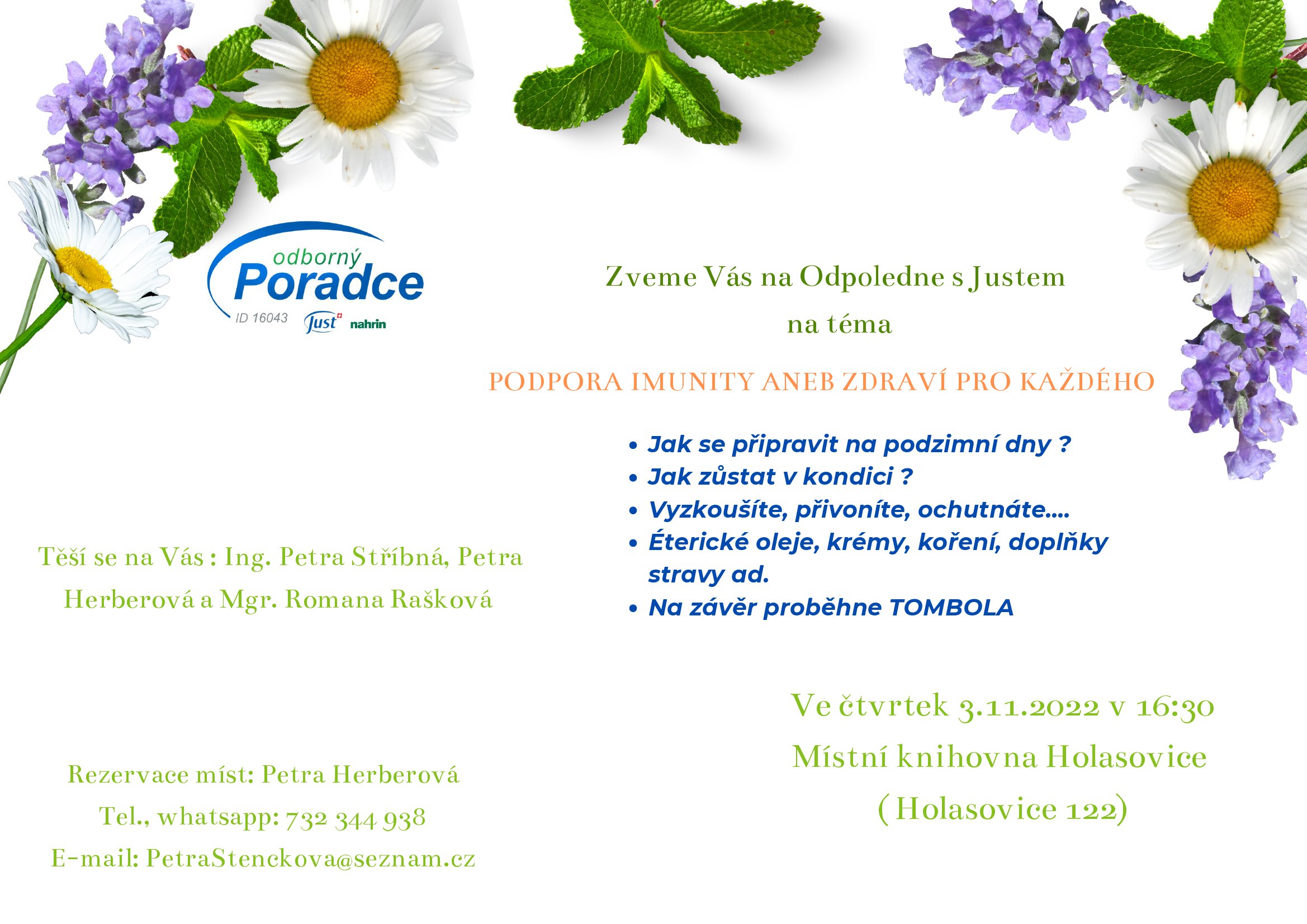Organizer Místní knihovna Pavla Křížkovského Holasovice About event Přednáška o produktech firmy JUST, zaměřená na podporu imunity.