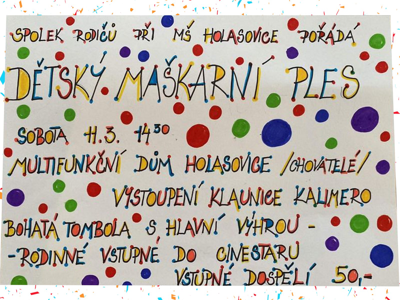 Organizer Spolek rodičů při školce Holasovice About event Dětský maškarní ples. Na programu je kromě zábavy i vystoupení klaunice Kalimero a bohatá tombola. Vstupné je 50 Kč/dospělá osoba.